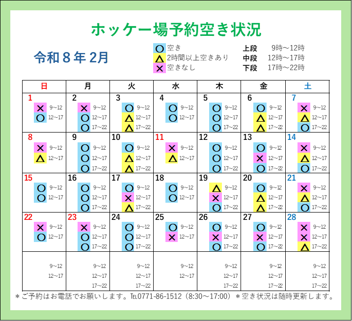 公開日時: 2026年2月20日717 × 654 (【2/20更新】人工芝ホッケー場 予約空き状況(2026年2月〜5月))