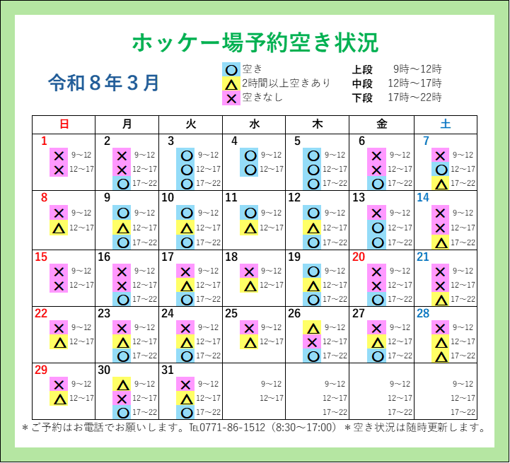 公開日時: 2026年1月31日721 × 655 (【2/1更新】人工芝ホッケー場 予約空き状況(2026年2月〜5月))