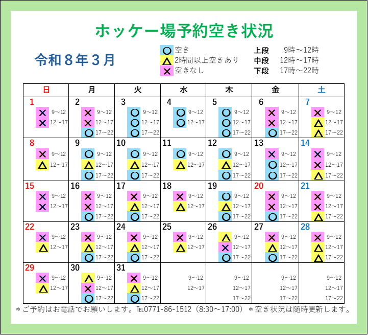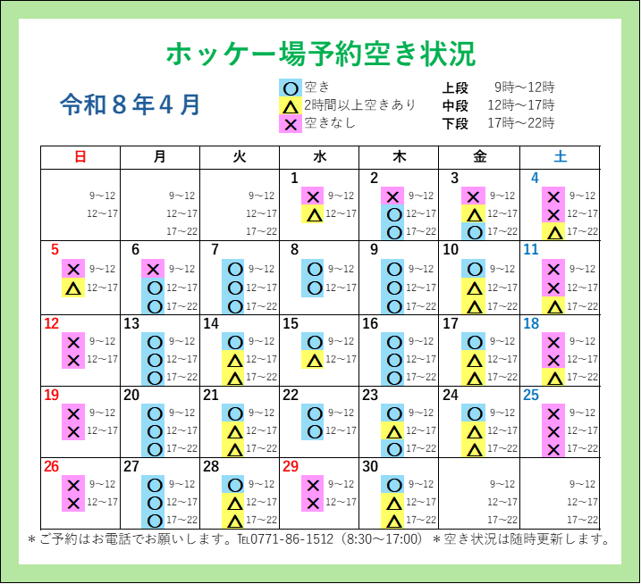 直近、4ケ月分の「人工芝ホッケー場予約空き状況」カレンダーを掲載しております。
