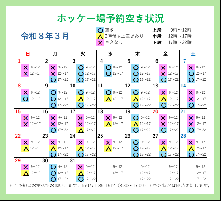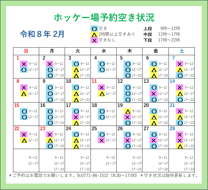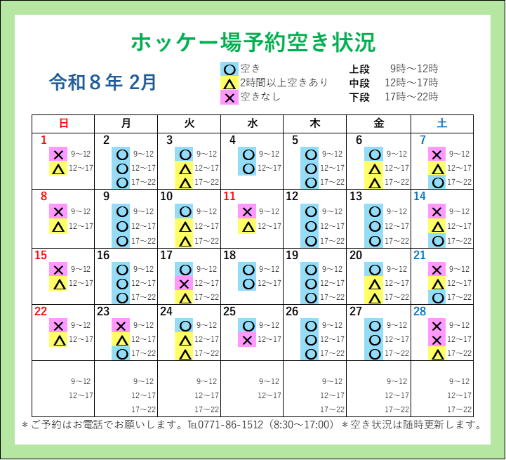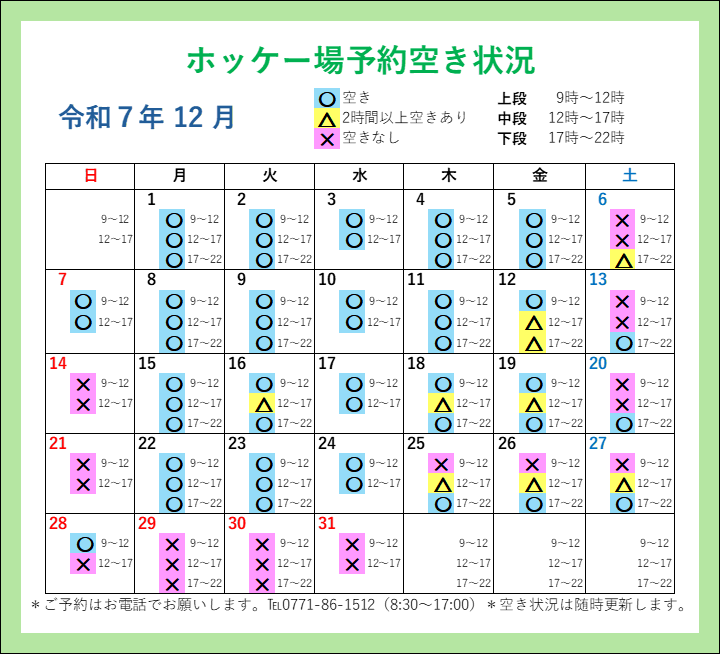 直近、4ケ月分の「人工芝ホッケー場予約空き状況」カレンダーを掲載しております。